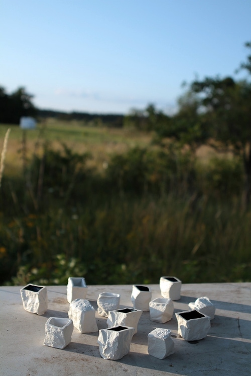 The collection A Shallow and Salty Ocean is homage to the Gotland’s geographical and industrial heritage. Moulds were taken from select fragments of limestone collected on the island and cast in fine porcelain resulting in an ongoing series of vessels. The intricate stone texture and sharp, aggressive crystalline structure makes these pieces as much functional as they are sculptural. The monotone unglazed exterior juxtaposes the gloss, colourful interior glaze, reminiscent of a shining mineral found within a broken rock.