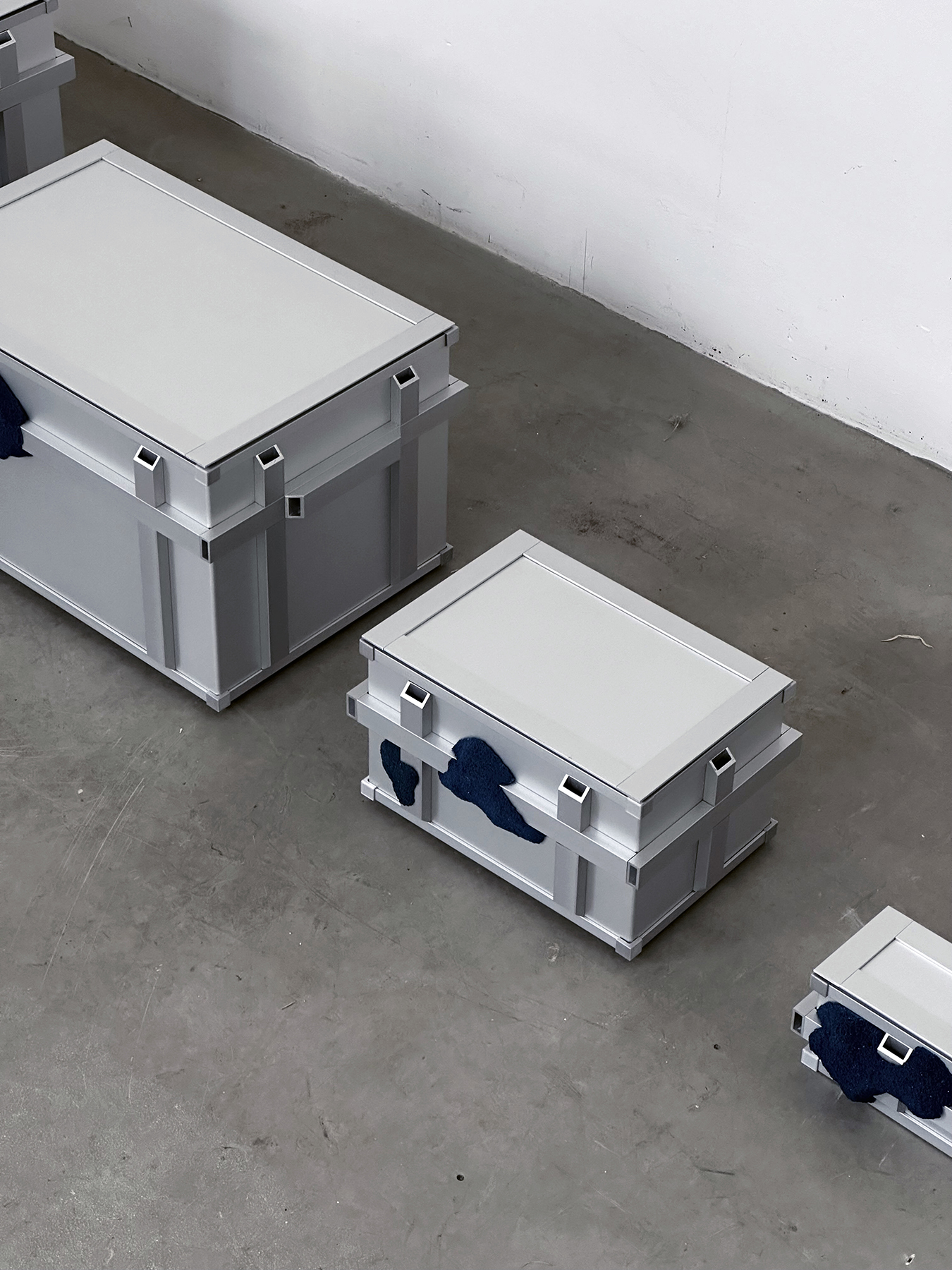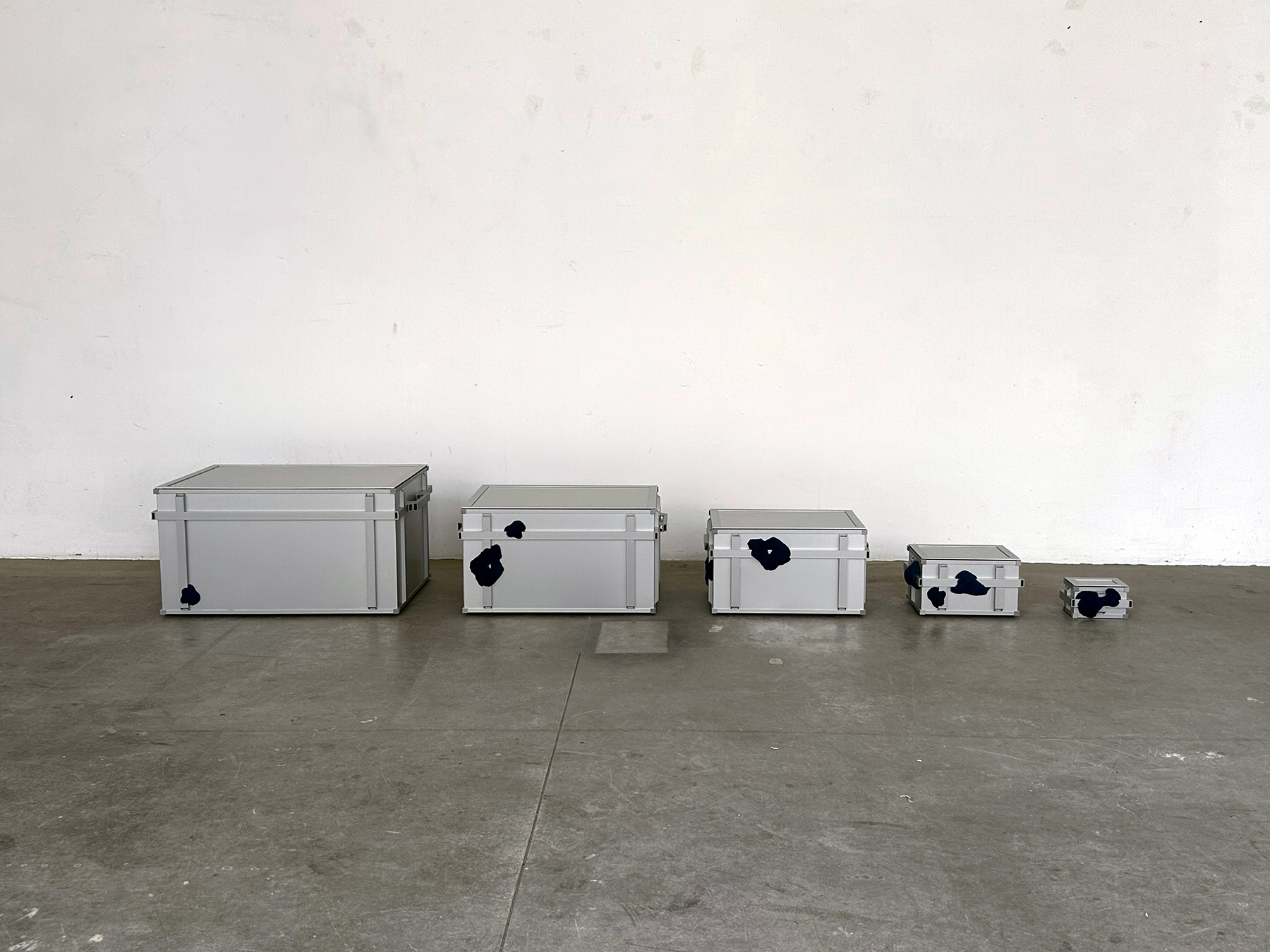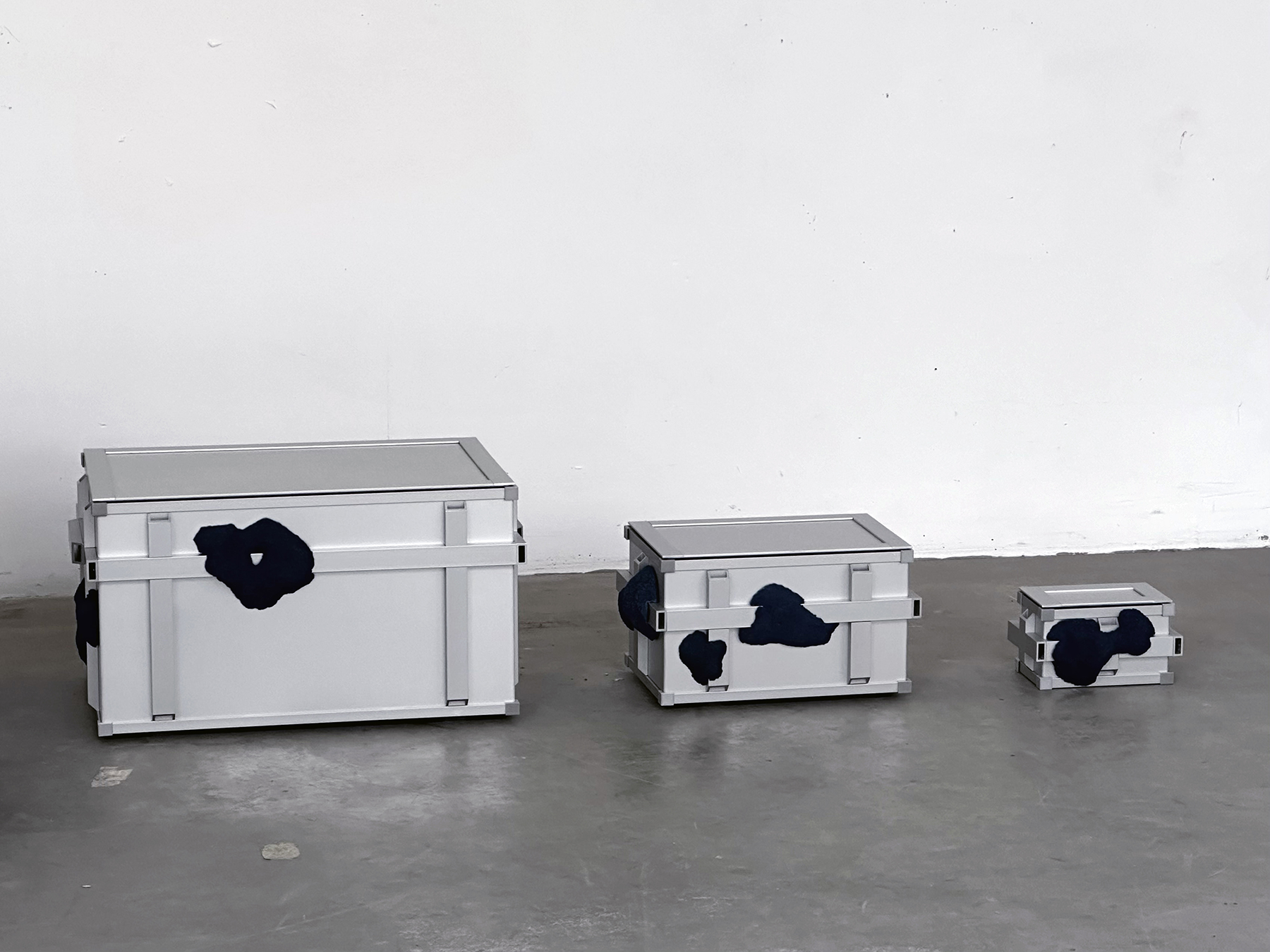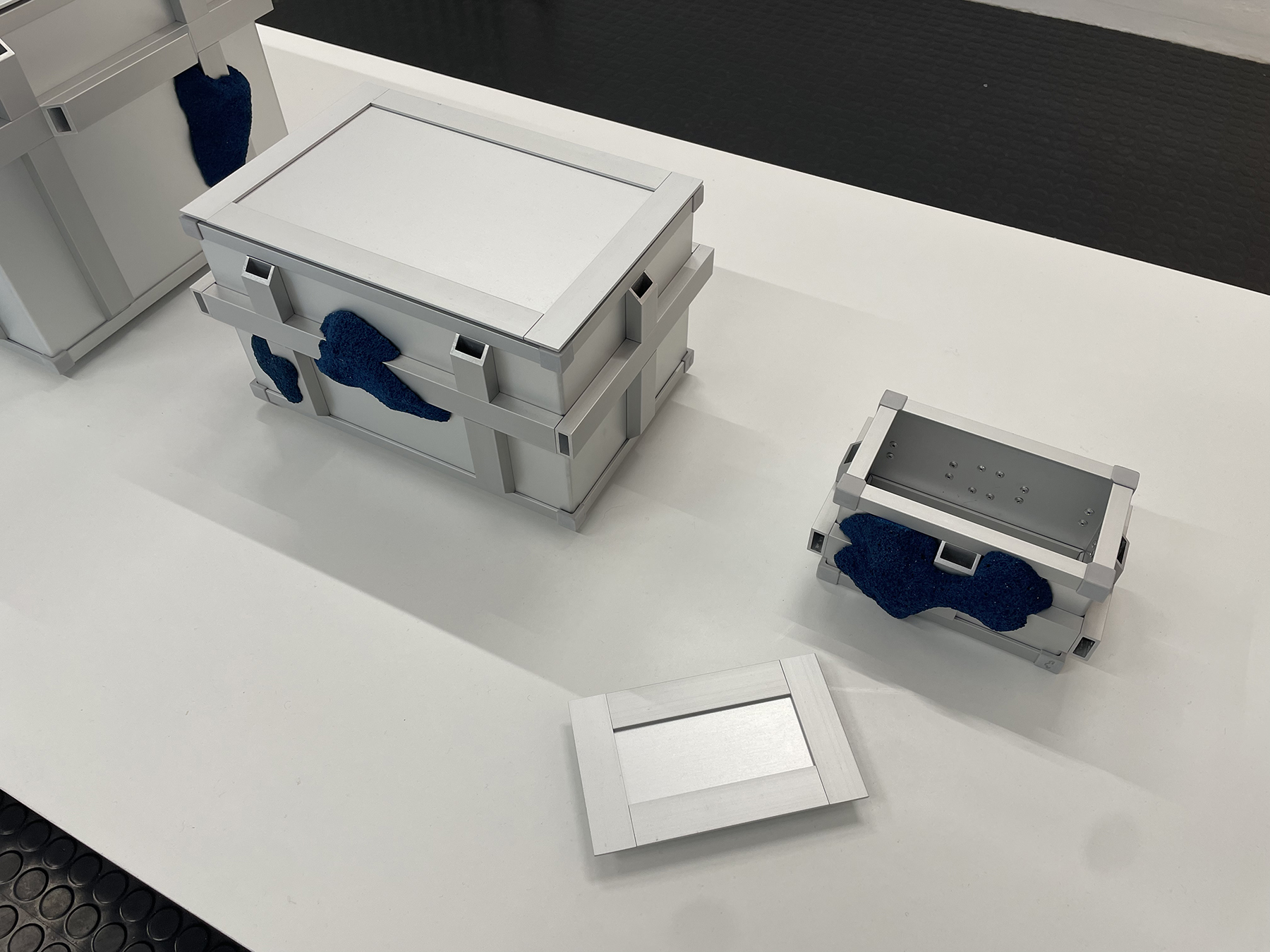 Kleinladungsträger is a series of storage containers based on the classic transport boxes of the same name, redesigned in anodised aluminium with Jesmonite accents; an opulent juxtaposition to the injection moulded polypropylene of the originals.