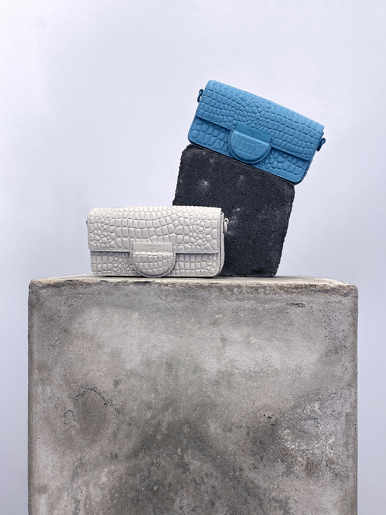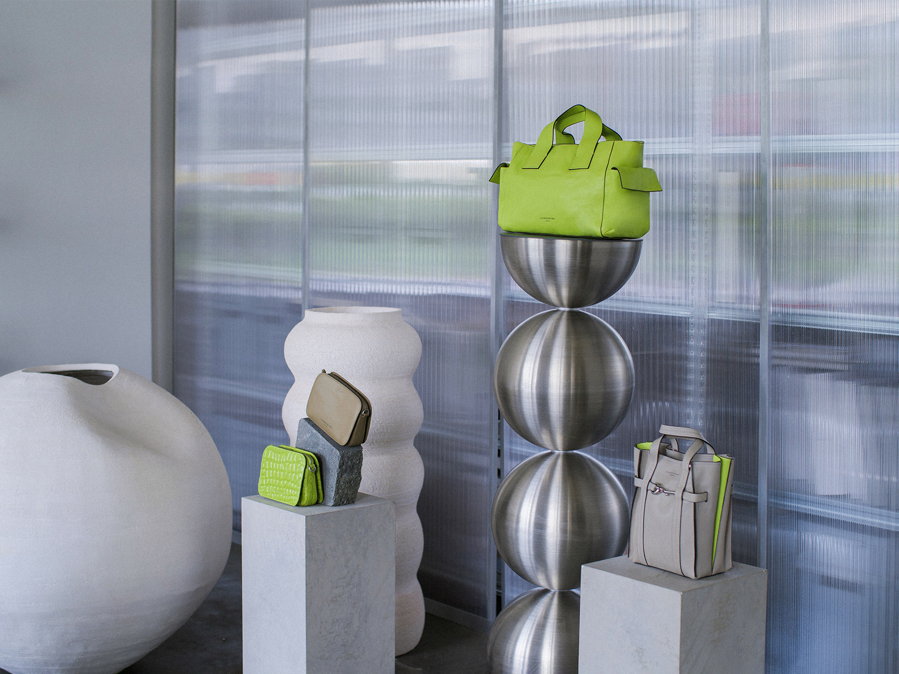 Sculptural product and food displays for luxury leather brand LIEBESKIND BERLIN’s Berlin Gallery Weekend Pop Up, reflecting on the city’s architectural landscapes and the core design narratives of the brand.