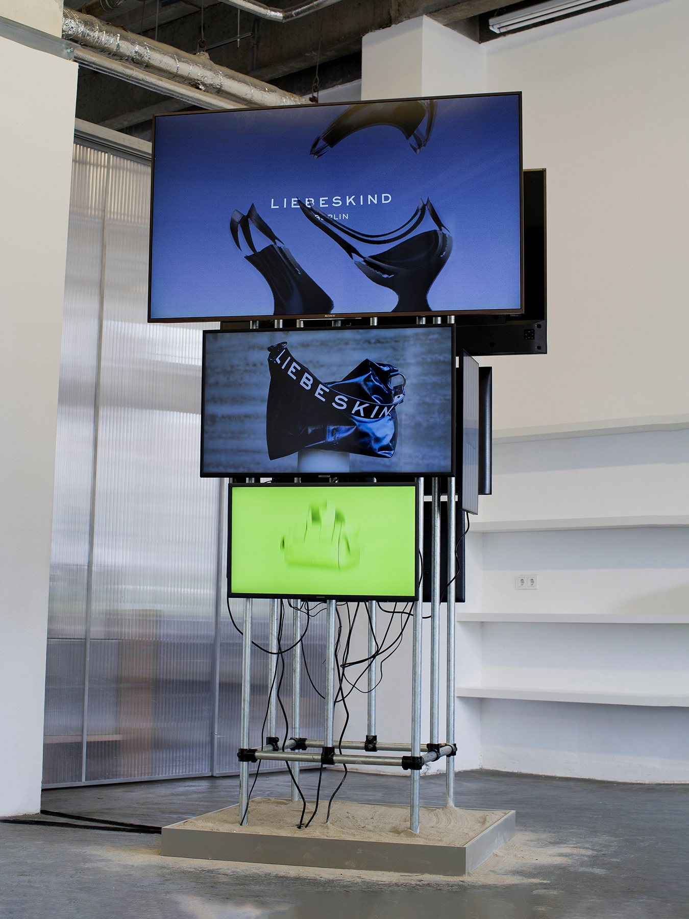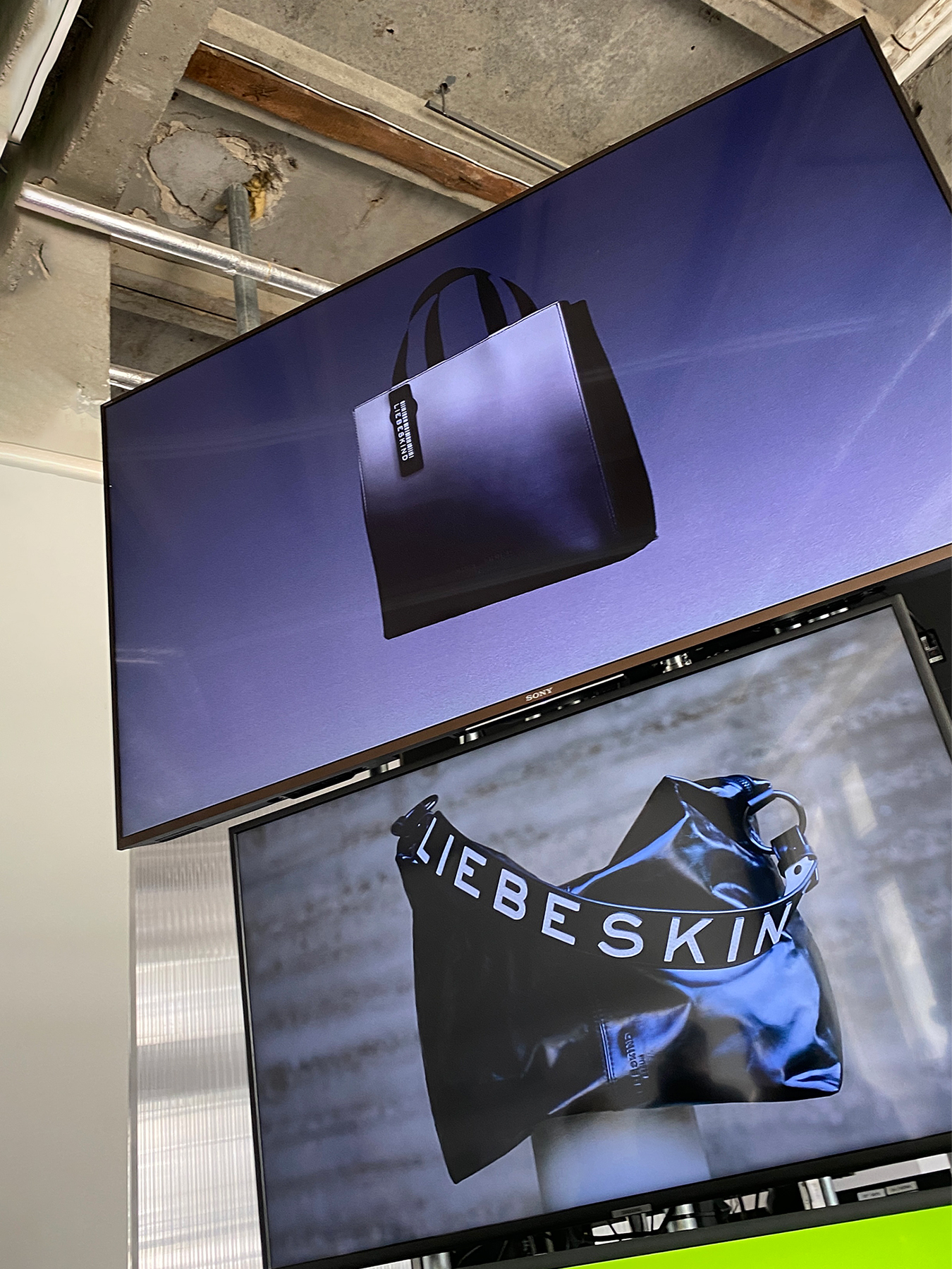Custom concrete plinths showcased pieces from LIEBESKIND’s latest collection, alongside a TV monitor tower; constructed from steel tubing, scaffolding components, and a dry concrete-filled base, which displayed campaign visuals and animations. In the centre of the space, an industrial aluminium kitchen table was adorned with concrete elements, live moss, ceramic wares by Jana Francke and sculptural food displays crafted by Caique Tizzi. The installation merged tactile materials and contemporary design, creating an immersive and memorable brand experience.